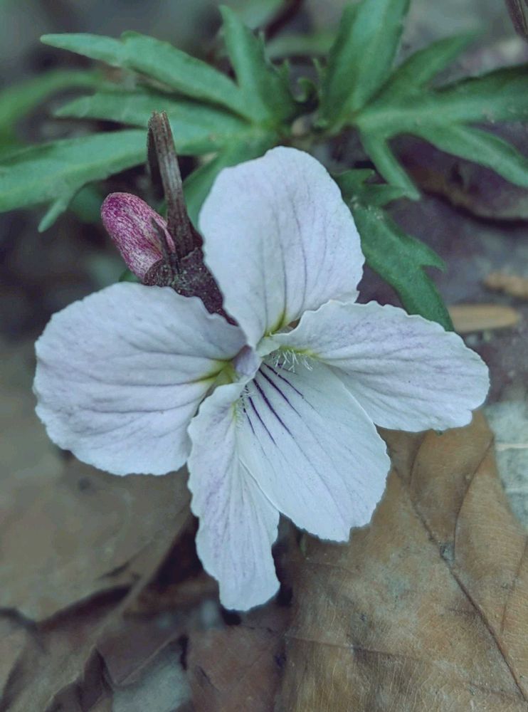 ③切れ葉の代表ヒゴスミレと微妙な違いは生育環境や葉の切れ込みでエイザンが3裂、ヒゴが5裂ですがエイザンスミレは3裂し更に小枝の上で2裂するので少し見分けるのが難しいです😅