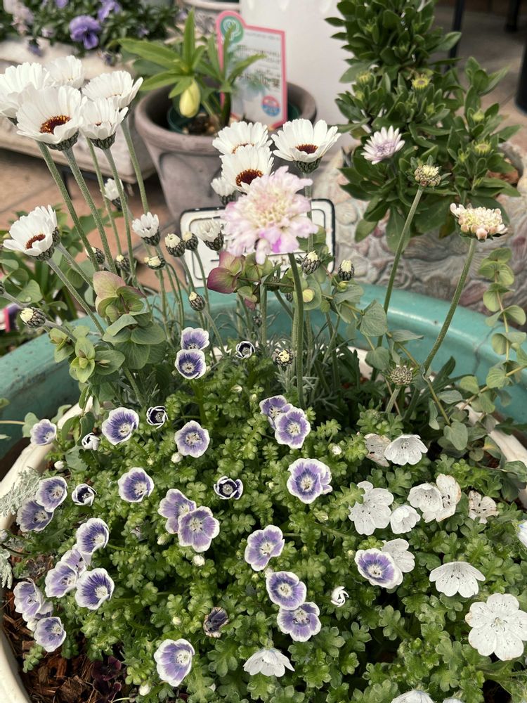 ①久しぶりにネモフィラをお迎えしてローダンセマムとスカビオサその他🍃と寄せました☺️