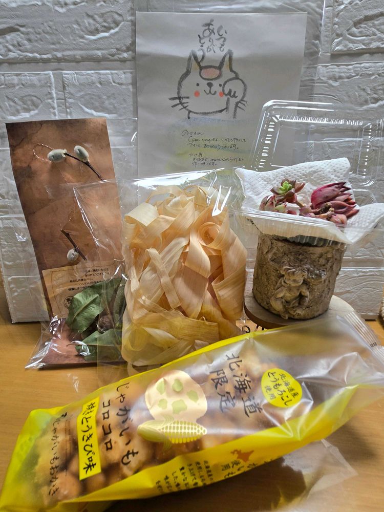 くるみ?にエンジェルちゃんのキーホルダーと良い香りの葉っぱ🌱と北海道限定じゃがいもコロコロのお菓子🍪これ他の味ですが北海道フェアで食べたことあります😋おいしいんですよね~😋本当にお忙しい中ありがとうございます<(_ _*)>