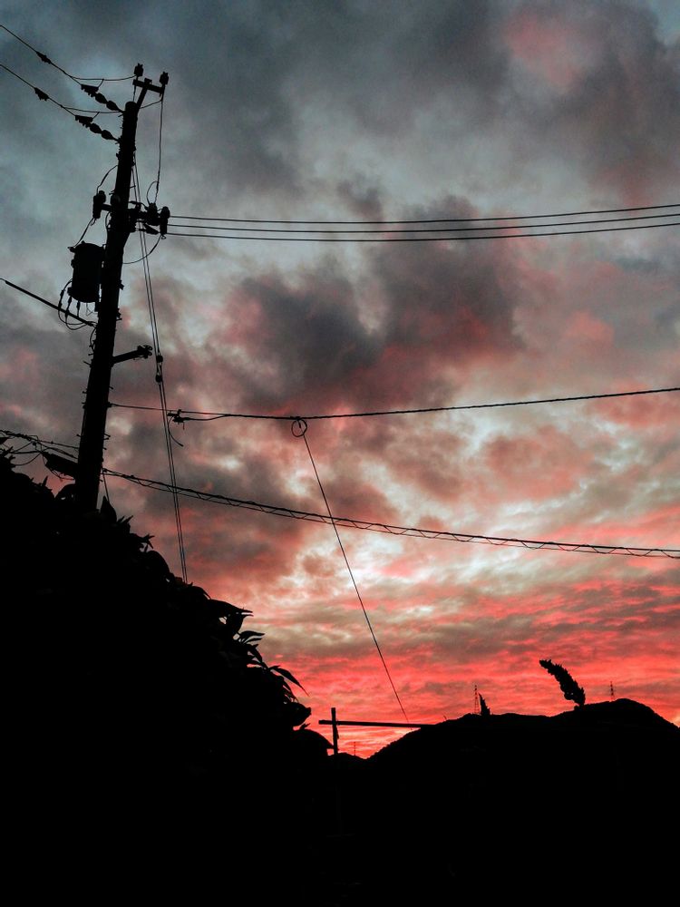 黒い雨雲と鮮やかなオレンジの夕焼けに、
