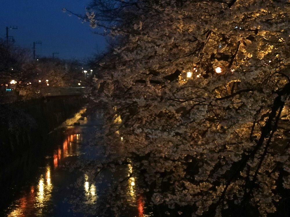 桜が彩る 川沿いの夜の風景をどうぞ。