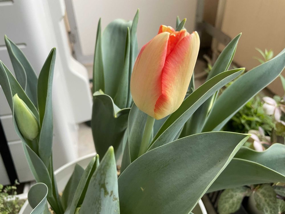 ベランダで富山産のチューリップの球根5個を植えていましたが、3/24頃まで花芽が出てくるのか心配でしたが、その後すぐ芽が出てきて3/30早朝にはこの色合いに🌷