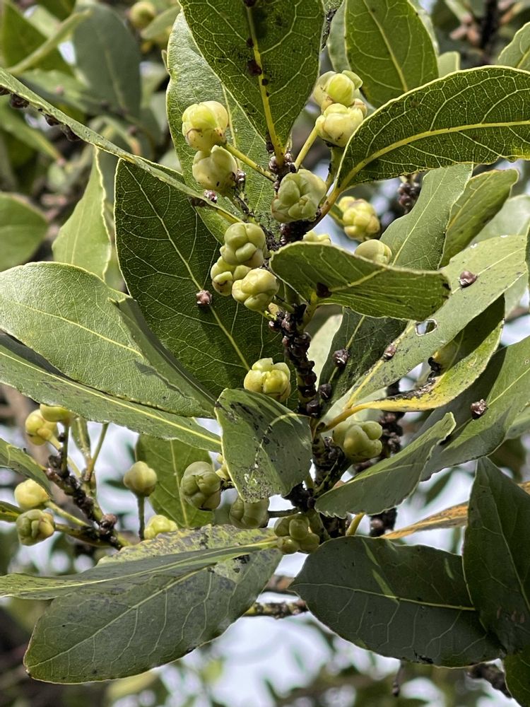 ➋ チョイチョイむしって来てはお料理に香りを添えてもらっている遊歩道の月桂樹の木です♪ 確か花はもっと寒い頃に黄色い小さい粒のような. .🙄