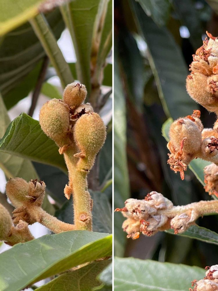 ➌ 今年初めて花が付きましたーッ‼︎ なんて言って何度か投稿してました種から育てている枇杷の木です♪ 花後がボコボコした薄茶色の塊りのようだったんですが、ここへ来て見違えるような変化が..👀❗️