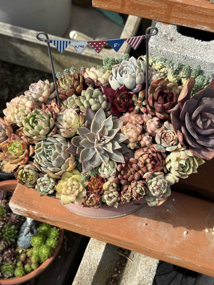 少し前に仕立て直しした寄せ植え❣️私はスカスカハゲ散らかした寄せ植えは、とりあえず全部抜いて、まだ活躍出来そうな子をピックアップして配置したら、新しい苗を使って作り直しているよ👍🥰