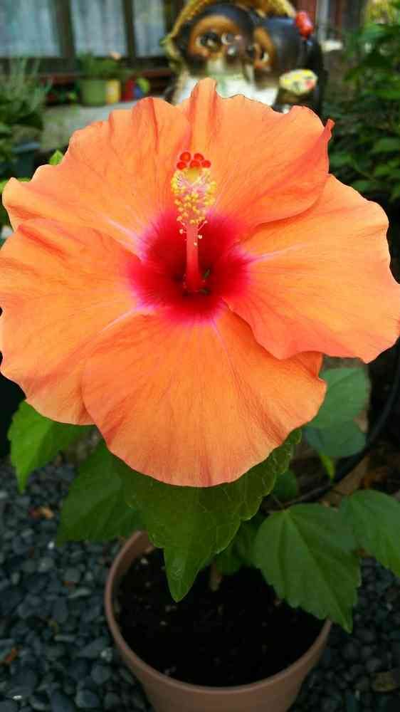 オレンジ色のハイビスカスもとっても綺麗ですが、後ろのタヌキさんも可愛くて気になります❤