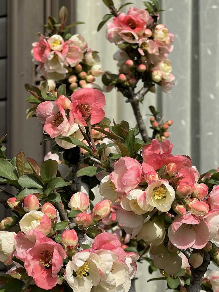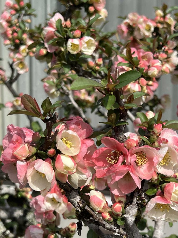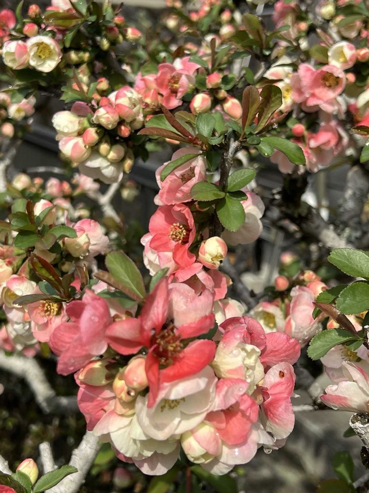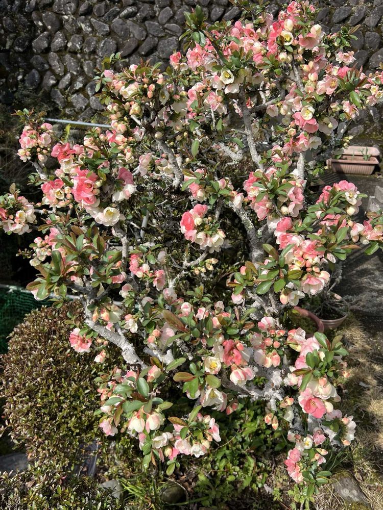 お隣の庭の、咲き分けする木瓜の花が素敵です