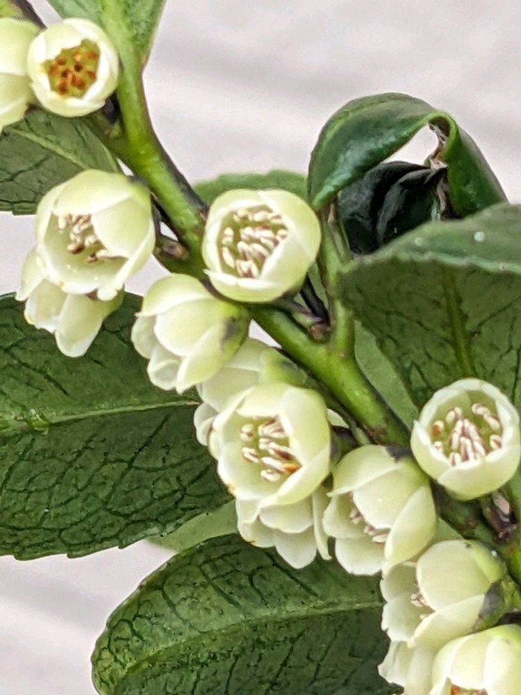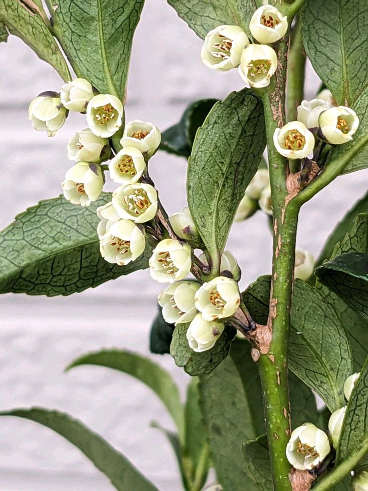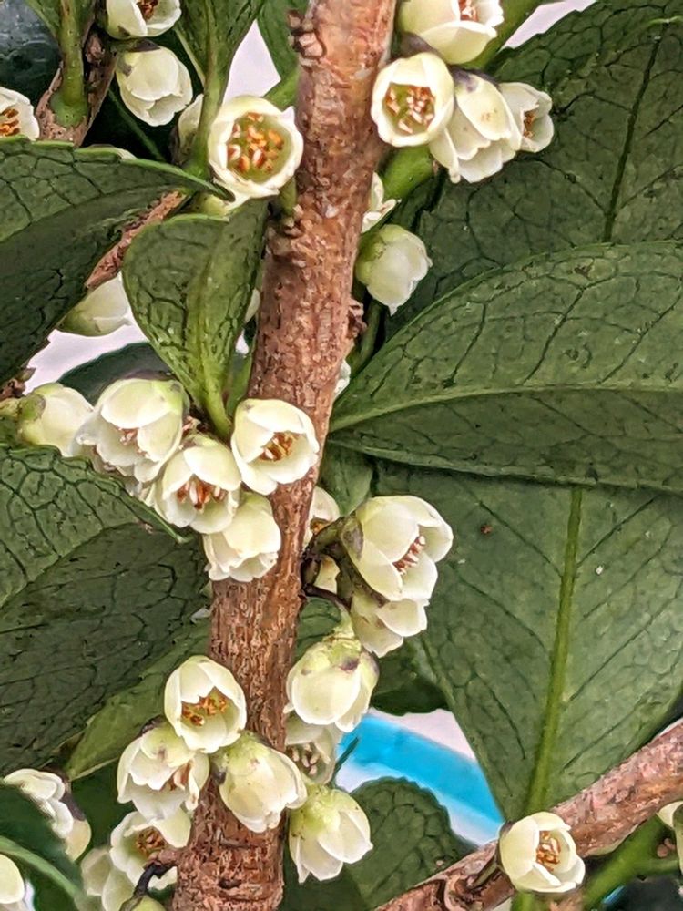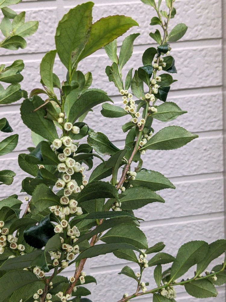 花はクリーム色で枝の下に並んで咲き、花の大きさは、5mm。