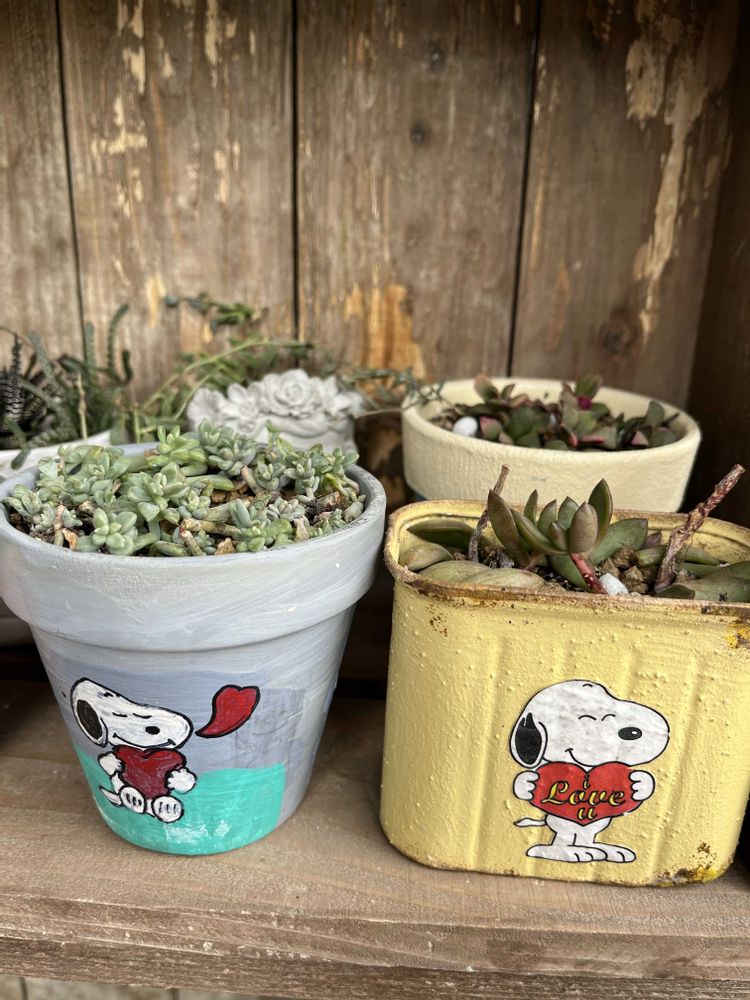 ①②スヌーピー鉢の多肉たち。冬無事に乗り超えてくれて良かった😀
