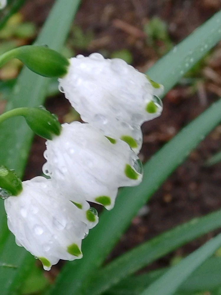 ❷今朝の花壇のスノーフレーク🥀雨粒まとって