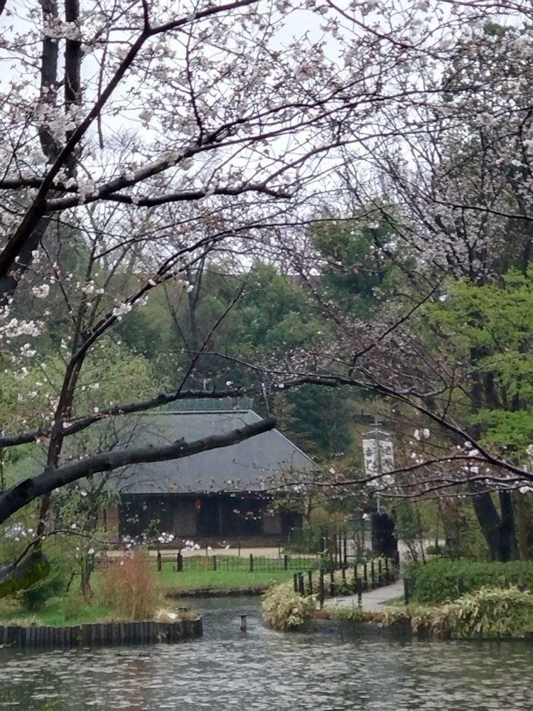 ❺せせらぎ公園の水辺と桜🌸と古民家と雨に濡れて🌧️