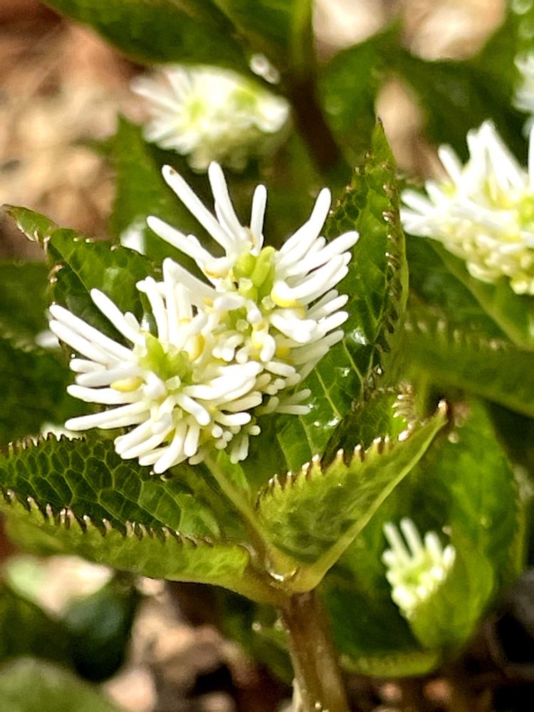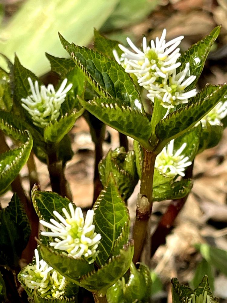 茎の先端付近に4枚の葉が輪生状に付きその中央からブラシ状の花が咲いています