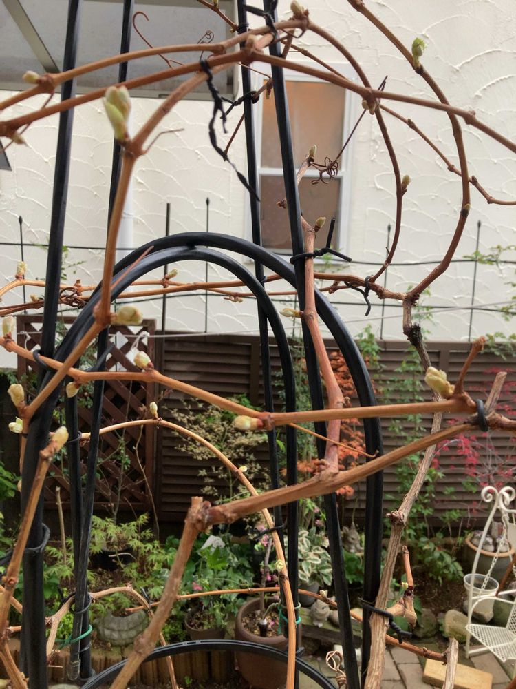 4〜5年目くらい?育て方の勉強不足で実がなりません💧枝がカラカラで枯れてるように見えましたが一応土替えと施肥しました、最近芽吹いて来ました🥹🌱場所がないので、オベリスクの上に更に支柱を追加してます😅今年こそはお世話して一房でも収穫出来るといいな😙🍇