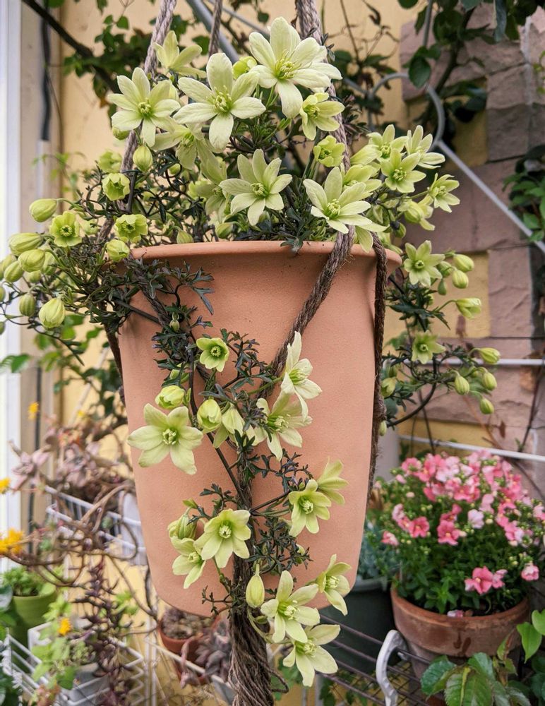 ペトリエイは他のクレマチスより弱い気がするので真夏と真冬は軒下に吊るしてました。