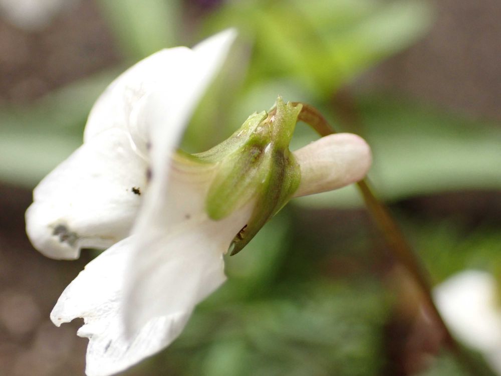 横から見てみると。距と萼の感じは、ヒゴスミレの図鑑の写真と似ています。(③)
