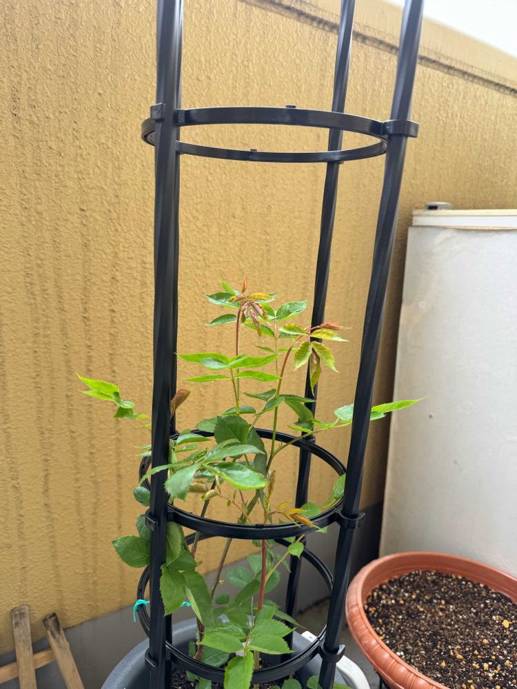 3度目トライの気むづかしい、河本ローズの爽は、今回、大苗をお迎えしたばかりで、まだ新芽が伸びて来たいちばんのしんがり。