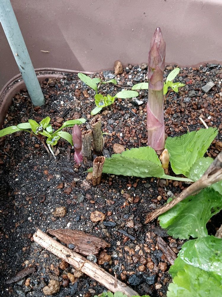 ③鉢植え栽培のアスパラが、お顔を出して来ました💚
