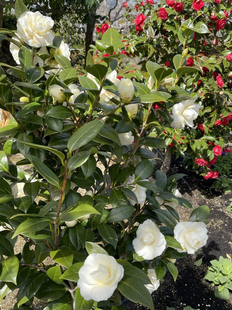 公園のツバキ園は、かなり奥の方にあって。数年前からよく見える場所に新たに2本。紅白で🇯🇵らしくていいですね。