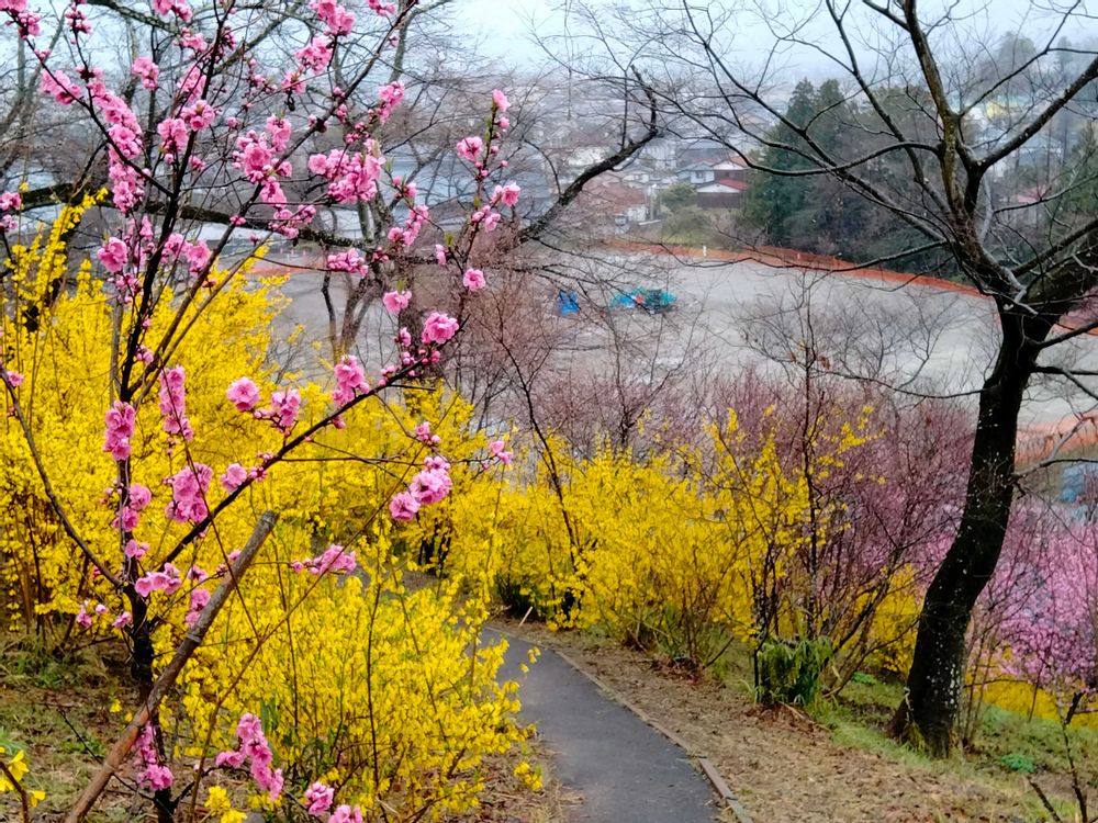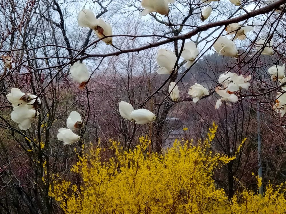 連翹の黄色が雨の中でも眩しいくらいに満開。
