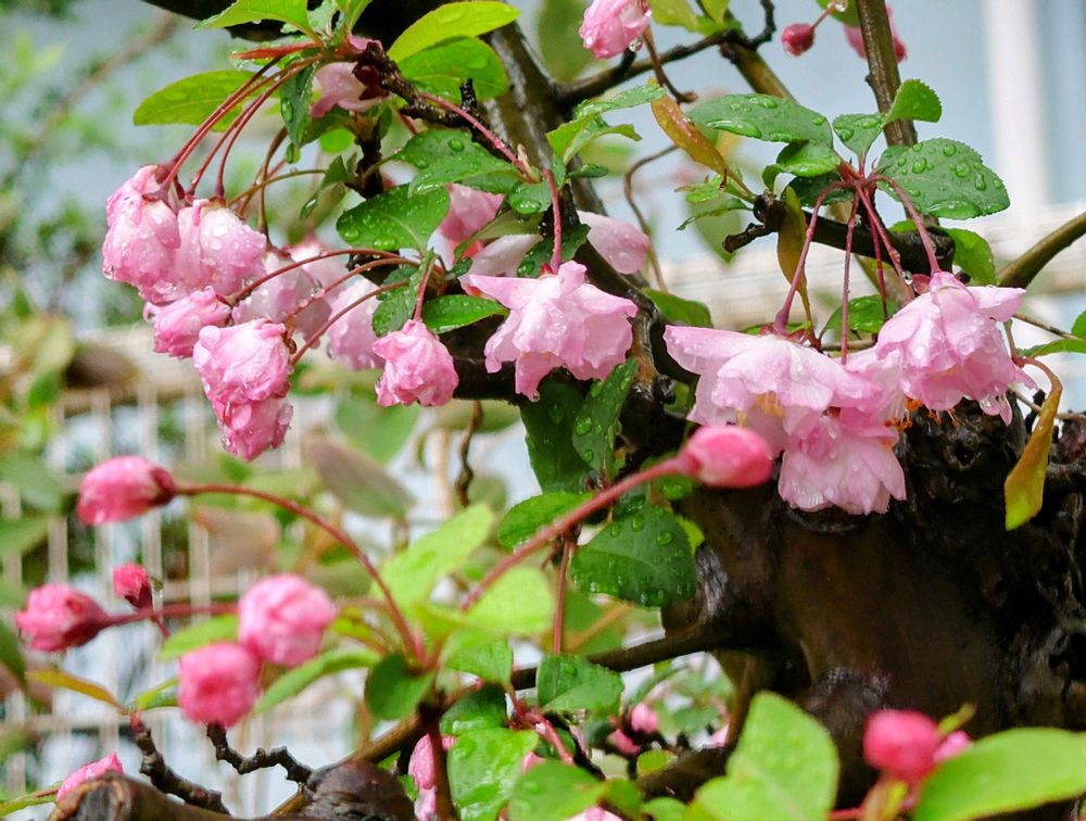 今朝小雨の中、通勤途中に見かけた花海棠。