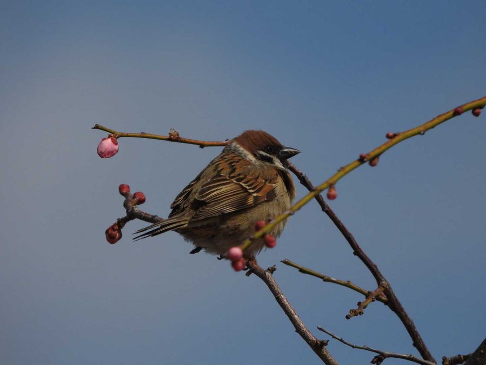 細い梅の枝にとまるまん丸したスズメ🐦🌸