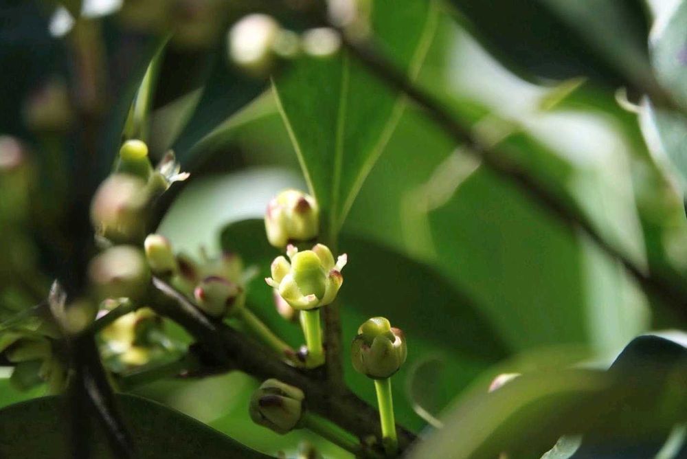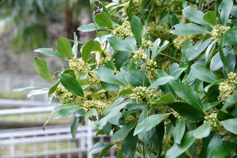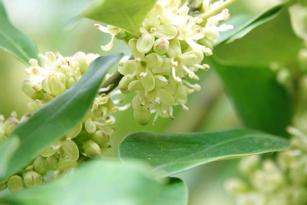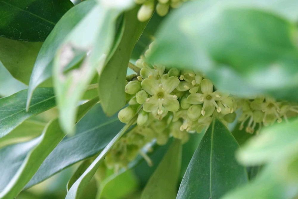 野鳥公園のモチノキは満開。花の大きさは1㌢くらい。