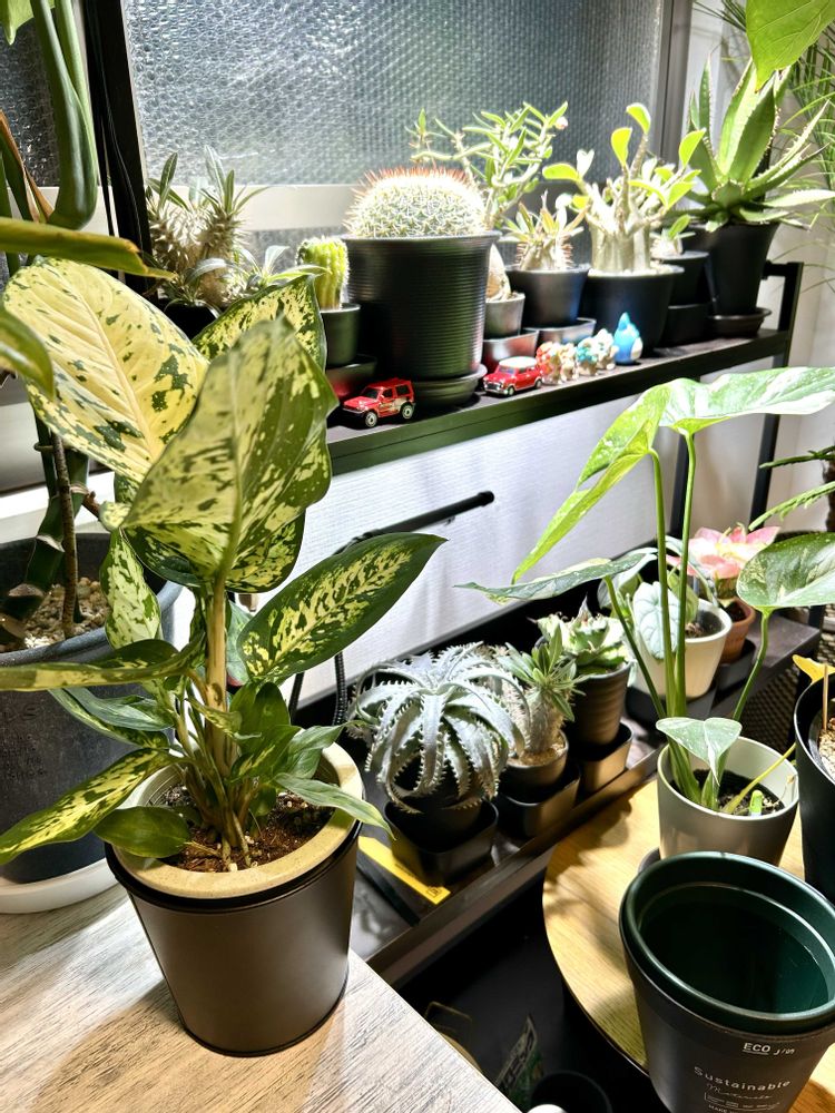 今日はシーサーの日😊🦁パキポディウムビスピノーサムさん2.3輪目が開花😊グラキリスカクチペスはうんともすんとも隊😊ディフェンバキアとアグラオネマがいい感じです〜