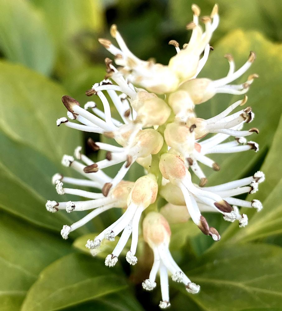 フッキソウの雄花は茎の上部に密に付きその下に雌花が5〜7個付く。