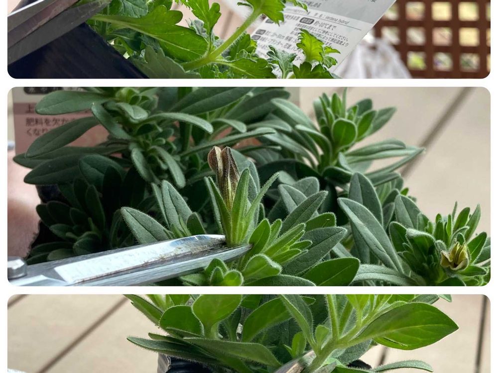 ③ポットからはみだした枝や新芽、蕾、花を摘みます
