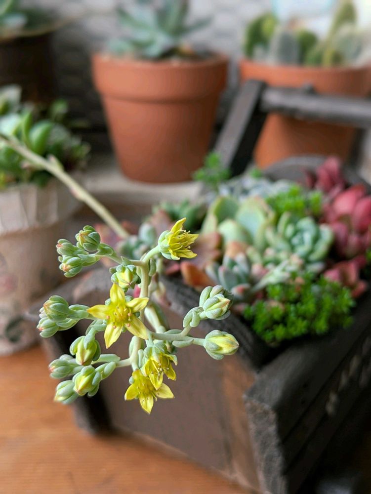多肉さんのお花💛可愛いですよね。ウチも、あっちこっちで花芽が成長中です💚