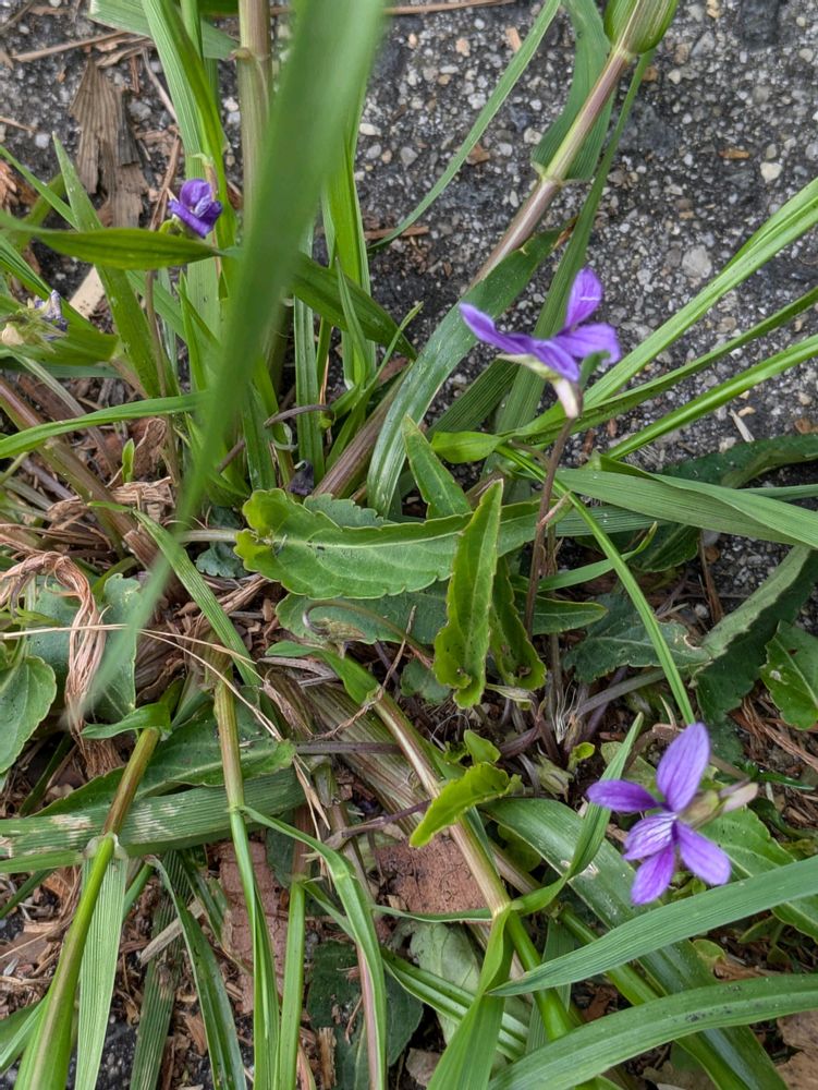 ②③スミレ?別名マンジュリカ、ホンスミレ 葉は長楕円形、花には白い筋がある。以前挙げたヒメスミレより、大きめでしっかりした感じ。バス道脇で