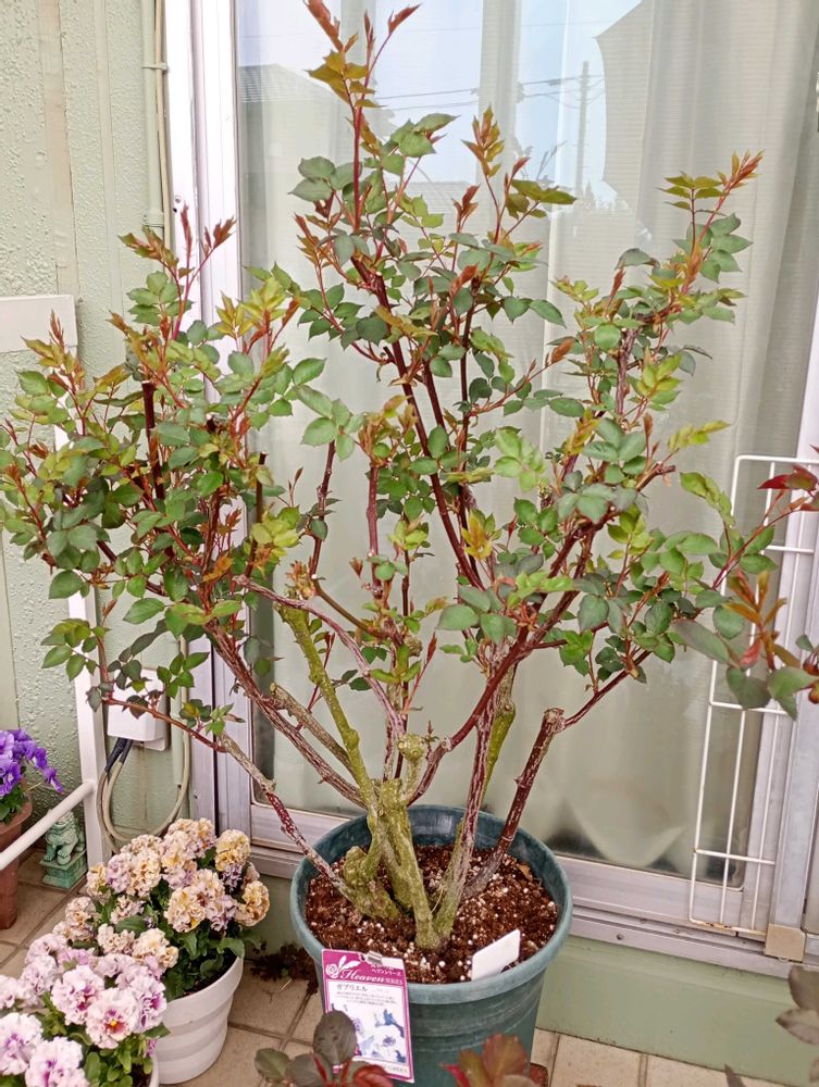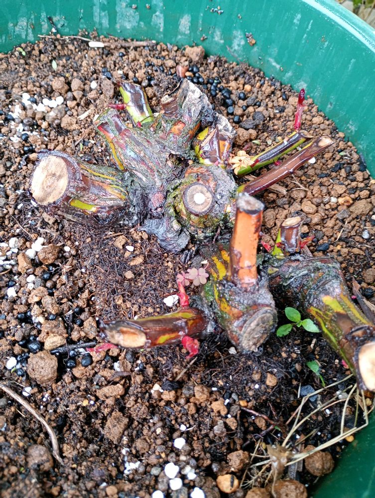 私もパッとしないホーム&ガーデンを冬に鉢替えしようとしたものの、やる気なくし💦もう捨てよ!と根鉢の土をかなり落とした状態で6号鉢に放り投げたまま一冬置いてました😔…生きてましたよ、ちゃんと赤い芽をだして。捨てるに捨てられなくなり、その鉢のまま古土入れました😅