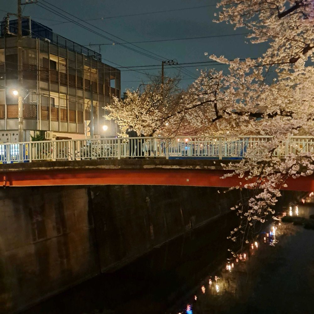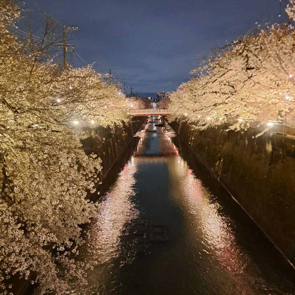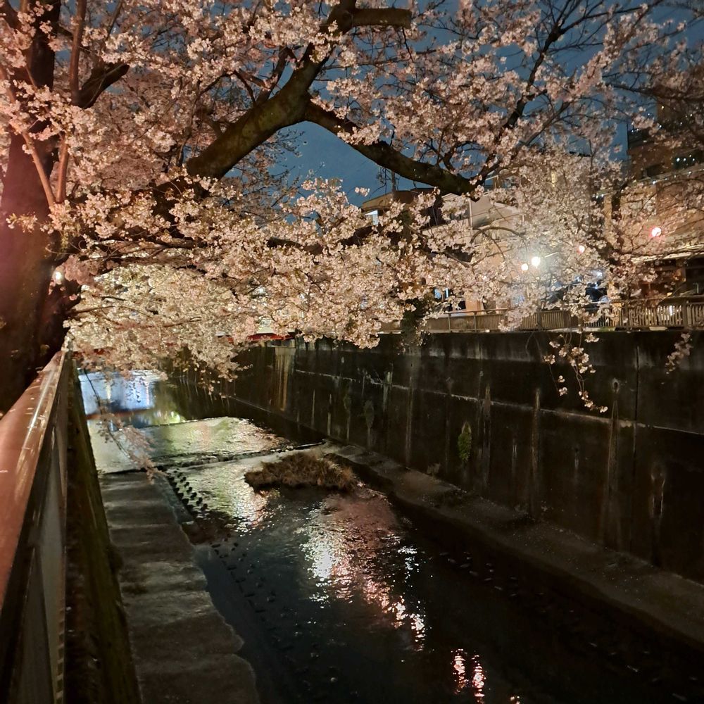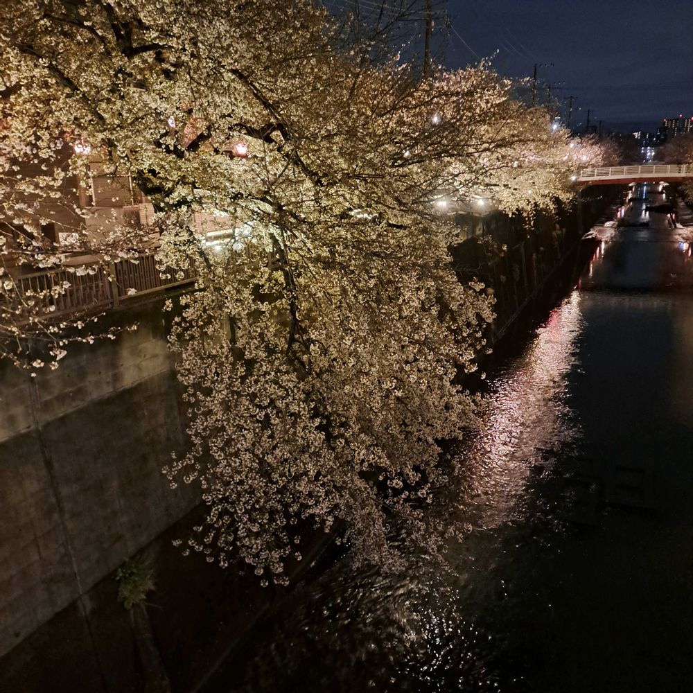 川沿いの桜がライトアップされ