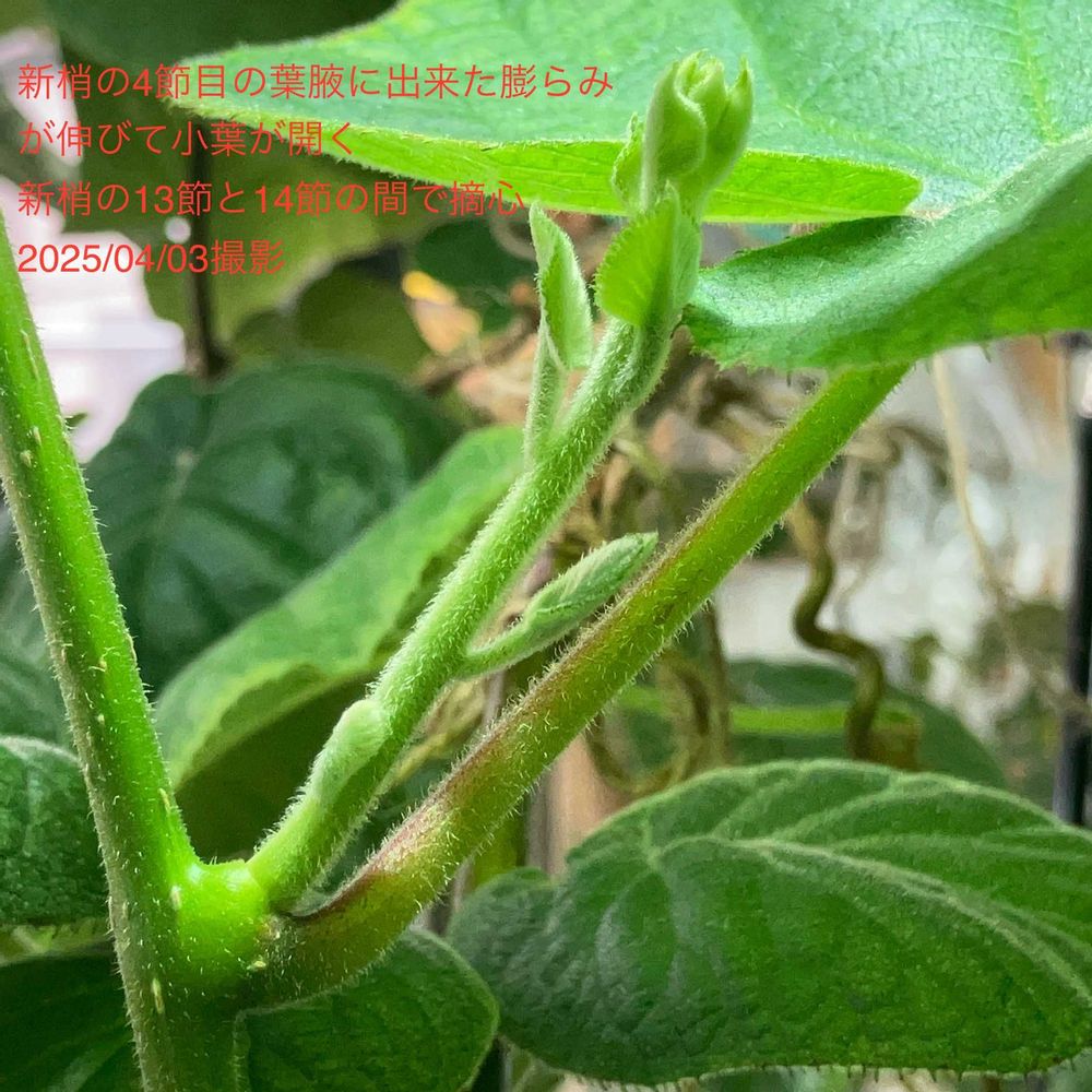 実生キウイの新梢の葉腋に出来た膨らみが長く伸びて葉が開いて来ました