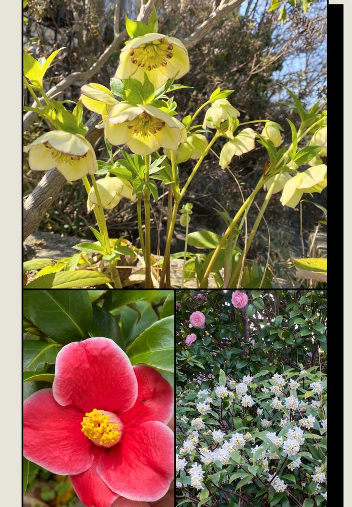 右下↘️は 白い沈丁花🤍🌿上に乙女椿も見えています💗🌿