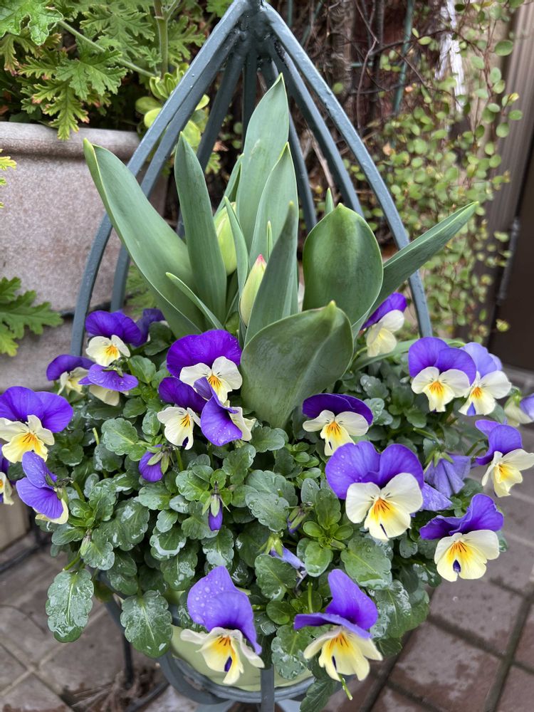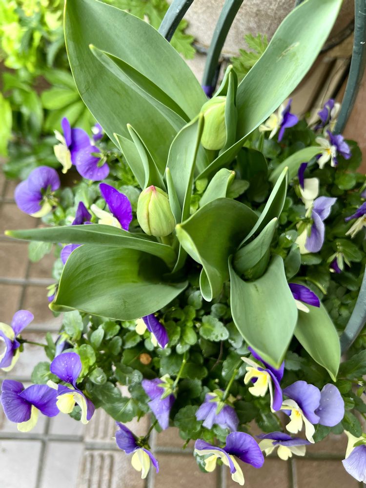 この、チューリップとビオラの寄せ植え、