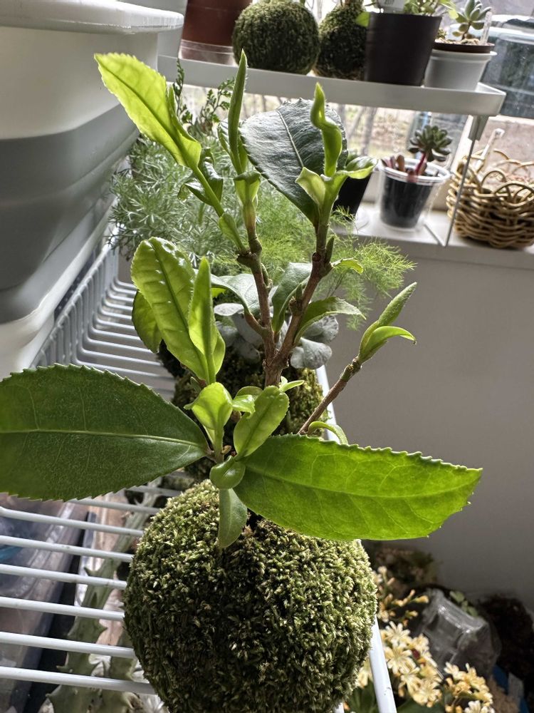 茶の木の苔玉、花を楽しんだ後に実が一つだけ有ったのも落ちて、新芽が増えました‼️