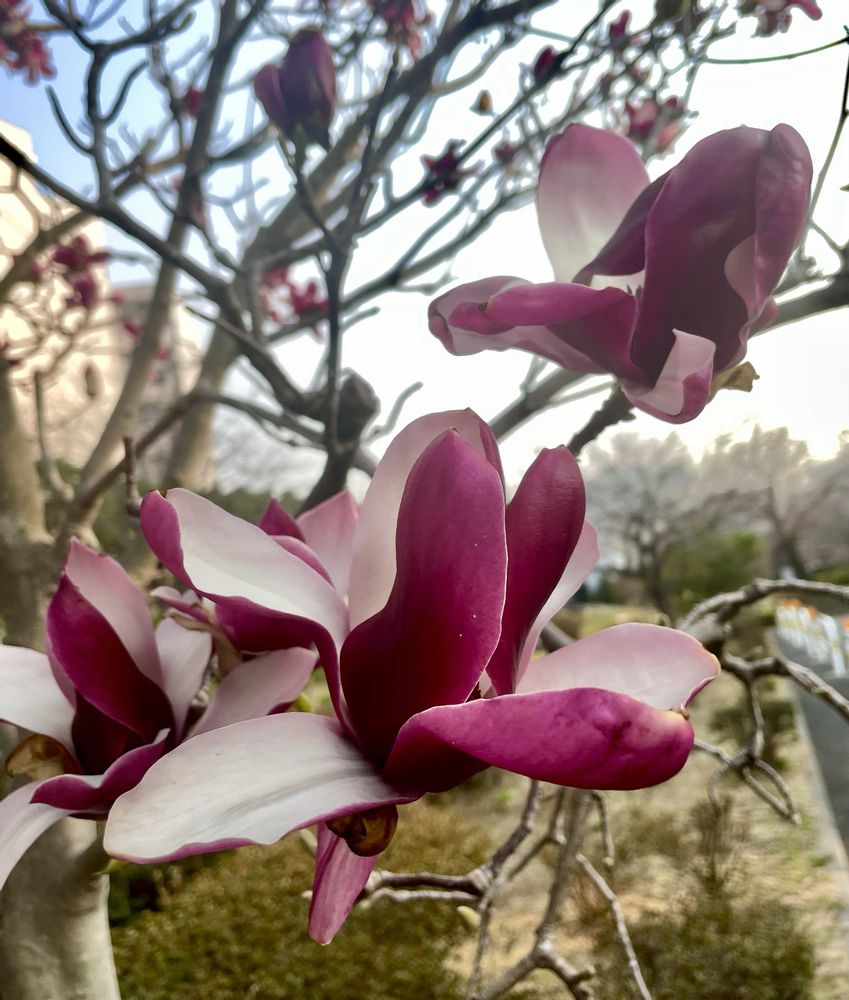 白木蓮と紫木蓮の交配種で外側が紫色内側が白色の錦木蓮ですが