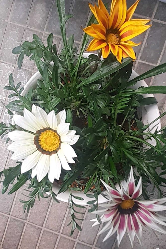 ガザニアさん、鉢に緑の葉っぱと3色の色が可愛いく咲いていますね🤍🧡💜