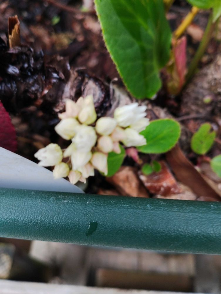 タンチョウソウ(イワヤツデ)の花が立ち上がってきている。周りに見えるのはヒマワリユキノシタの葉とは茎です。
