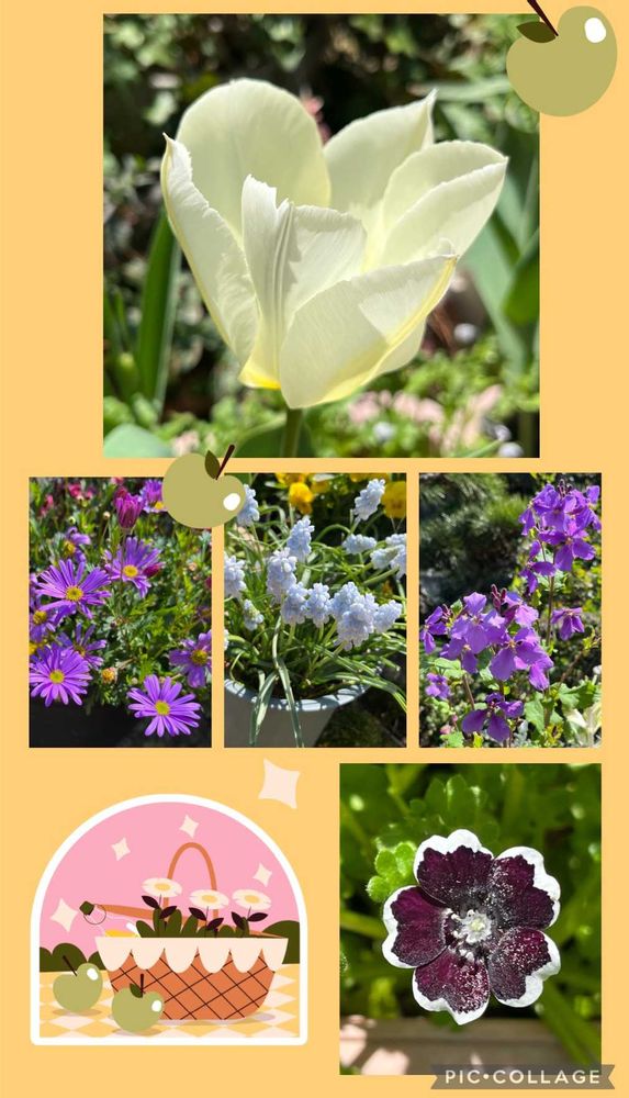 色々なお花さん達が咲いて庭が賑やかになりました^_^🎶💕チューリップ、ブラキカム、ムスカリ、ムラサキハナナ、ネモフィラ🤍🩵💜どのお花も可愛いですね🥰🍀
