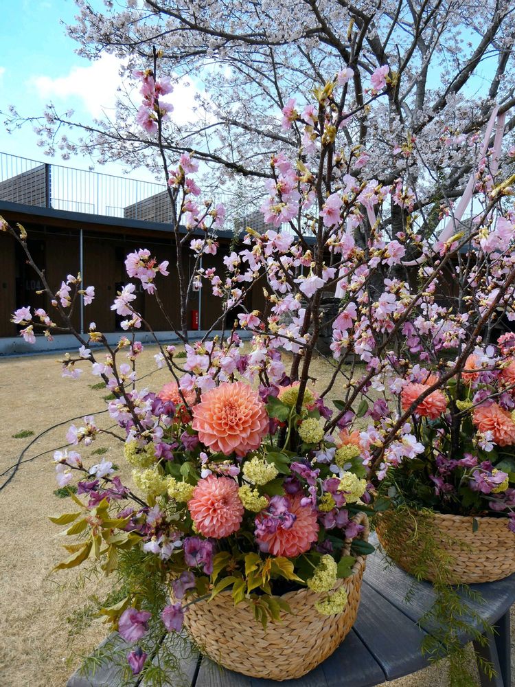 桜の木🌸の前に飾ってあったフラワーアレンジメントが華やかで綺麗でした😍💖