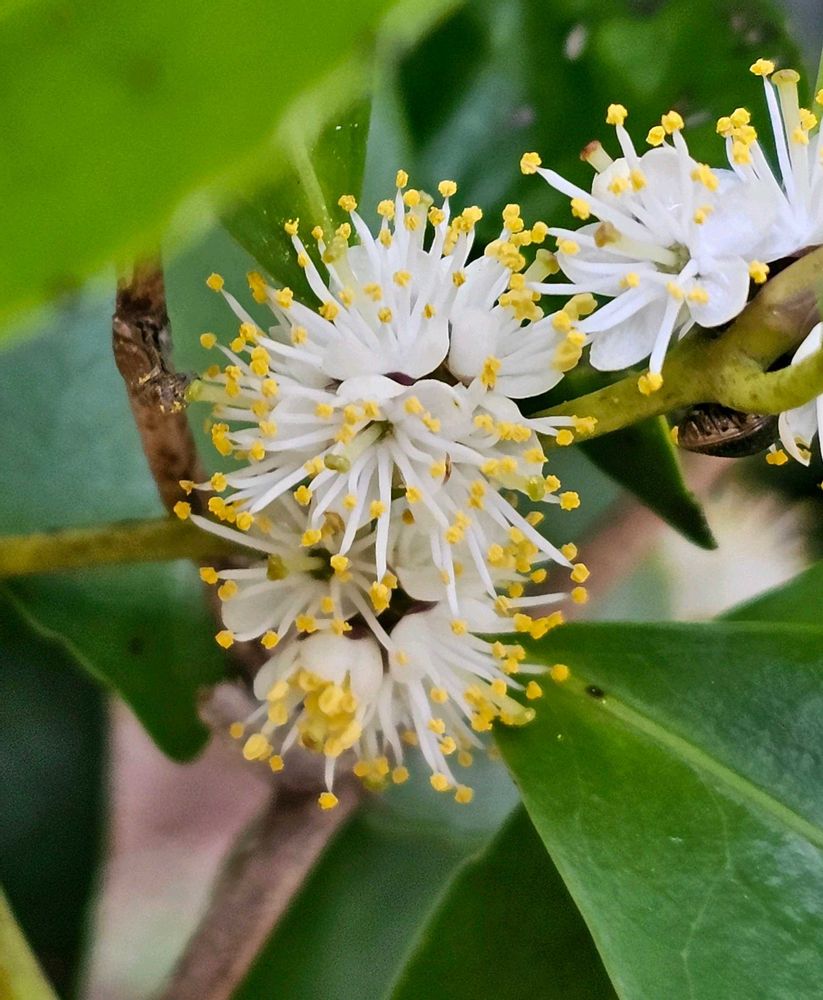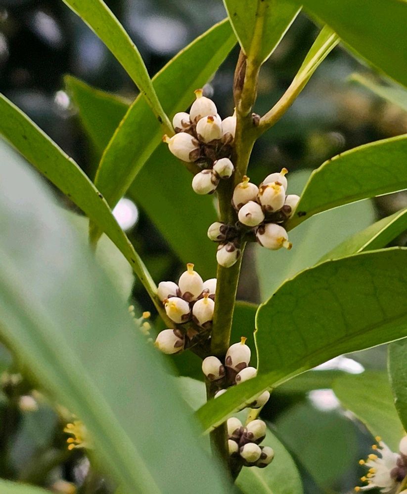 ①花期は3-4月 葉腋にごく短い穂状花序をだし白い花を密集させる 株によっては秋に色違いの花を咲かすという変わった性質を持つという