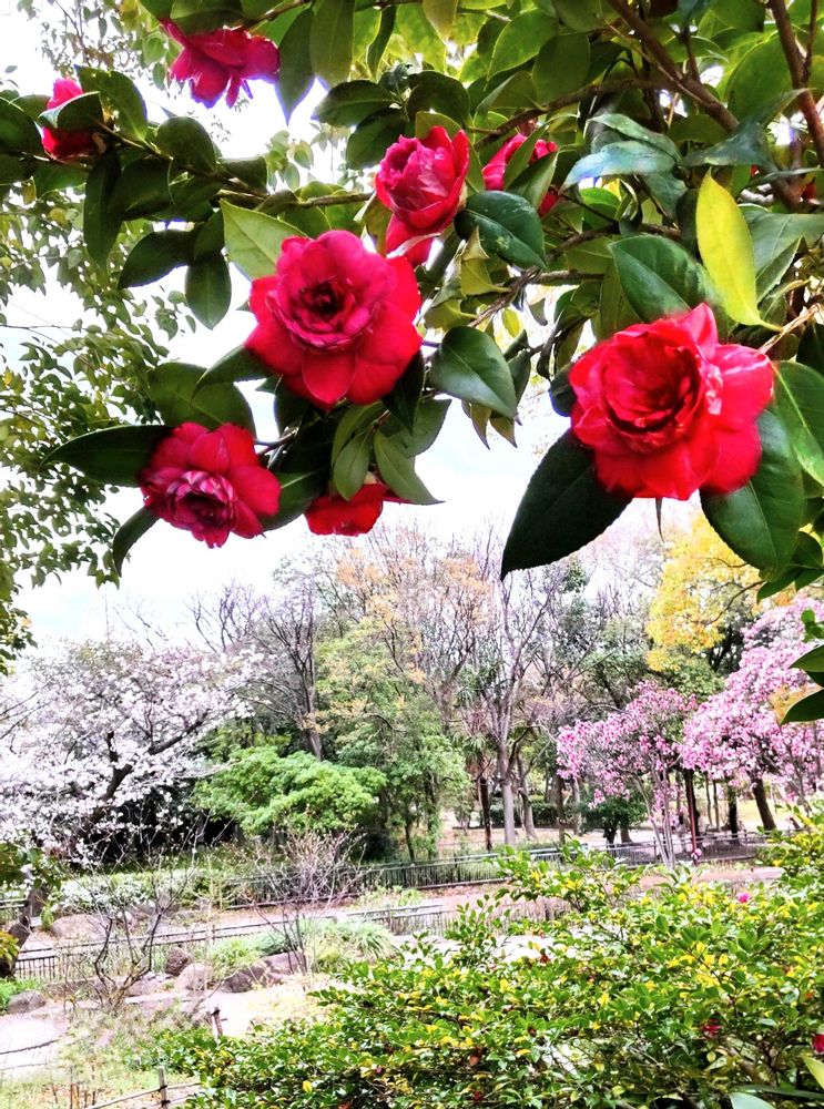 小高い丘に咲いてる椿を通して桜と木蘭を眺めてみました。