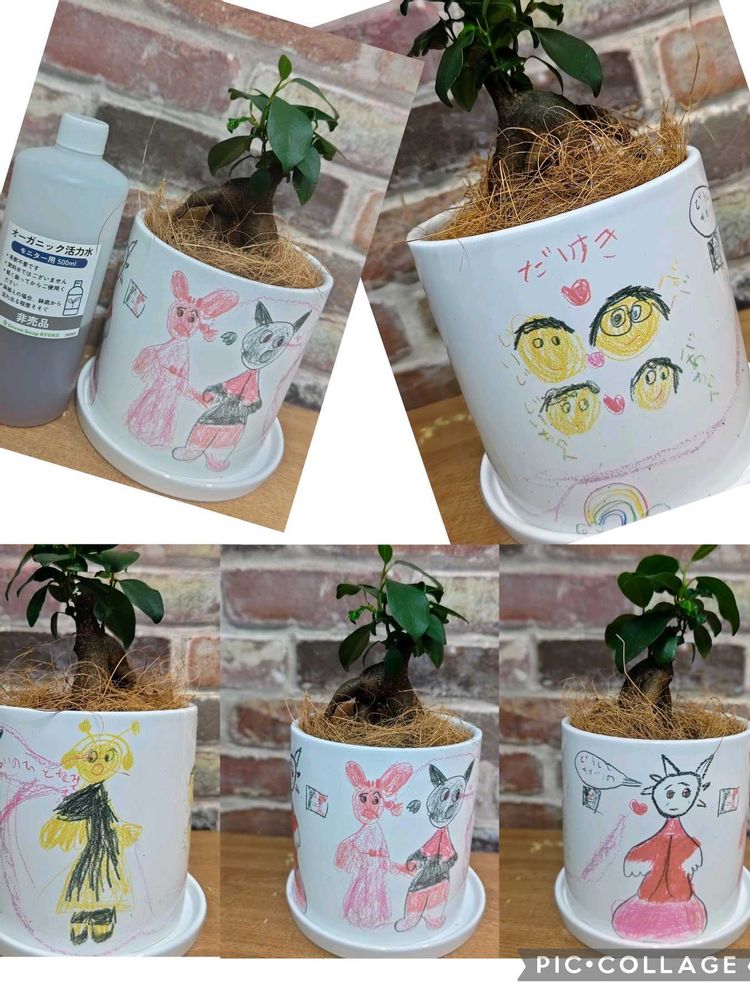 孫たちが描いた絵を、エアブラシで吹き付け加工したプリントのカバーの植木鉢。お花の宅急便📦️で送られてきて(4/2着)、ちょっと元気なくしてました😅