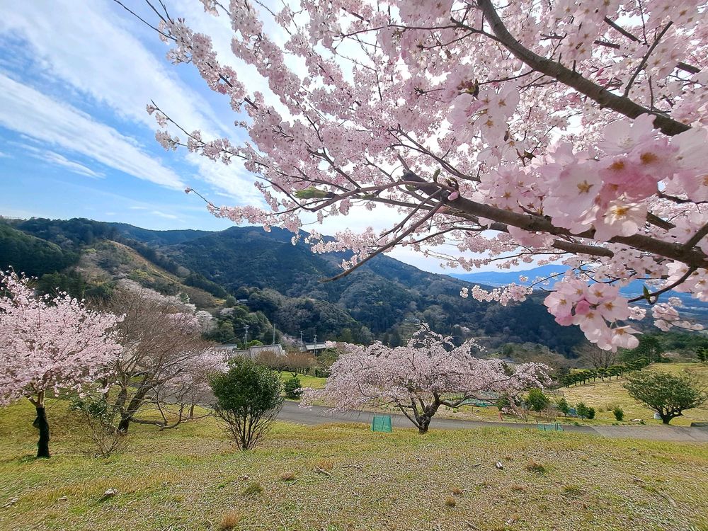 新城のマチュピチュとかいわれてる所で山の斜面に梅や桜が咲いています。