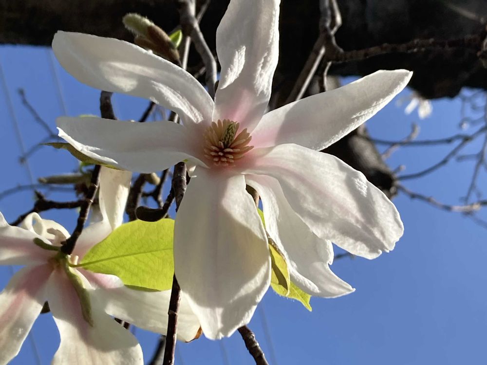 コブシのアップも美しいです。街路樹にあるから、写そうと試みました。でも、向こうから光が来るから、こんなふうには撮れませんでした。