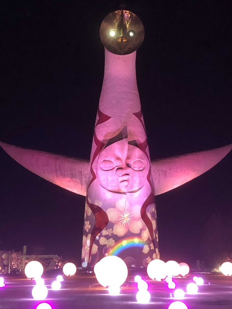 夜桜は「太陽の塔」や道路などにプロジェクション🌸されています。🌃📸🤗😄🌞✌️