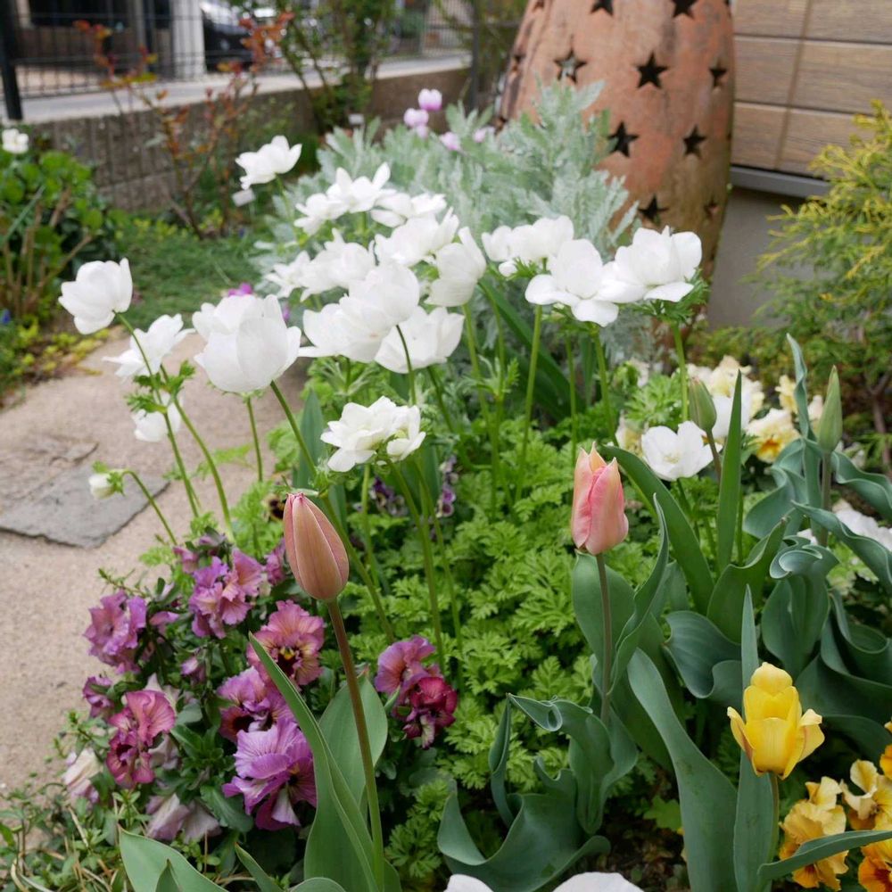 白いアネモネとチューリップとパンジー。