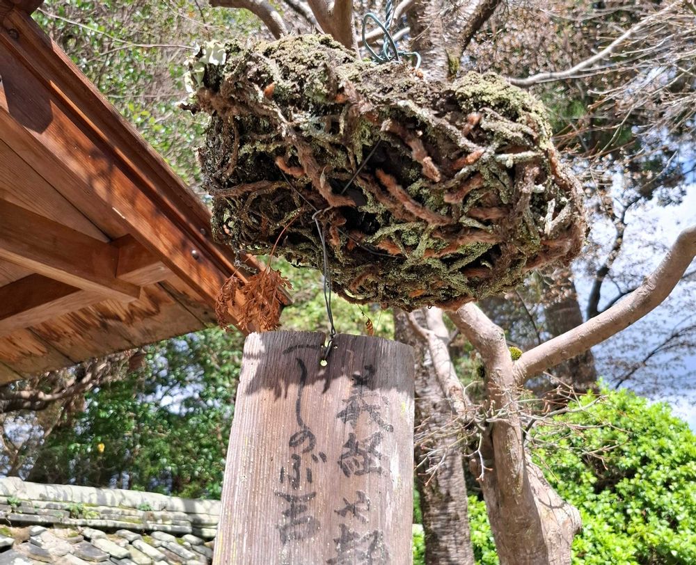 神社の門横に"シノブ"の苔玉、さりげなく一句「義経や静を"しのぶ"古跡や」